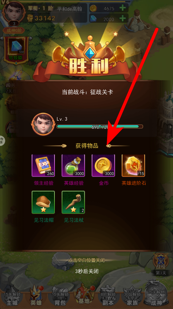 3、闯关战斗胜利后,领取领主经验、英雄经验、金币等丰厚奖励,用于提升领主等级、英雄实力,强化阵容,为后续挑战做好准备。