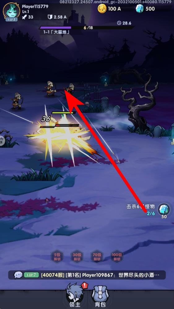 2、开始进入关卡1大墓地后,操控角色自动战斗,击杀怪物需达成击杀数量目标,推进关卡进度,获取经验、资源,提升角色等级与战力。