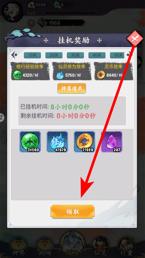 1、进入挂机奖励界面,待挂机时长积累后,点击领取,获取修行经验、仙灵修为、灵币等资源,用于提升角色与仙灵等级、强化战力,为挑战关卡做准备。
