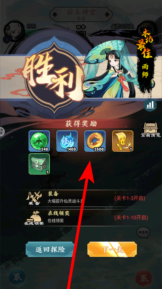 3、成功击败关卡敌人幽都山玄鬼后,弹出胜利界面,领取经验、修为、灵币、卷轴等奖励,这些资源可继续用于养成,点击下一关开启新冒险,循环积累提升。