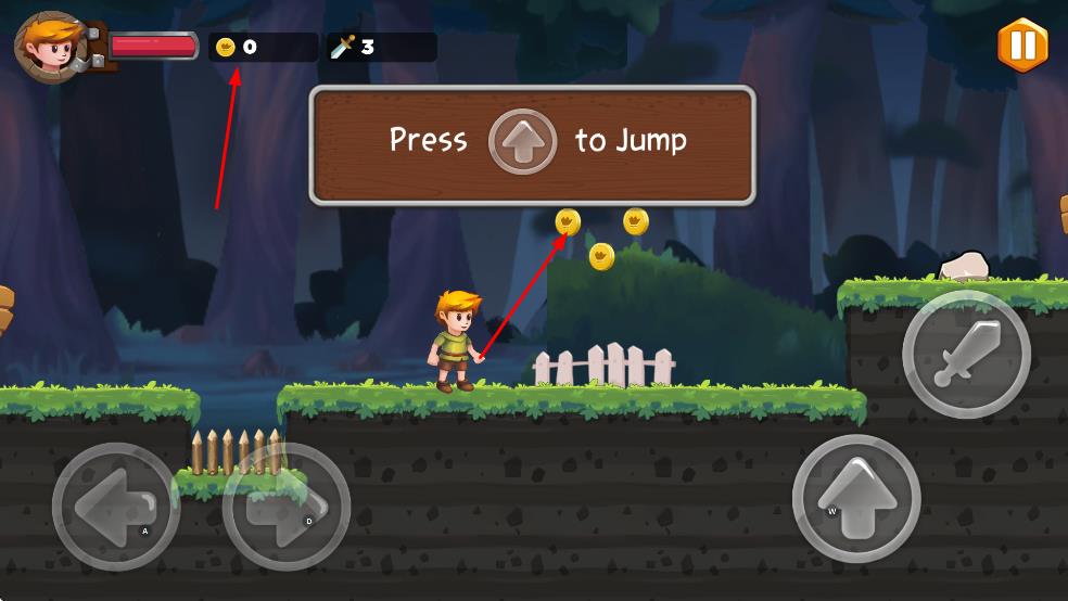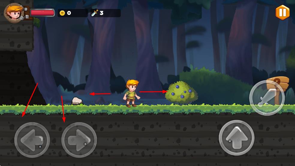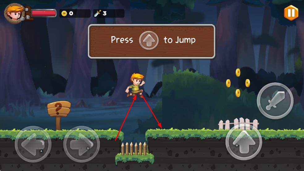 1. 左/右虚拟按键控角色移动,上键跳跃,跨越尖刺、沟壑等障碍。
