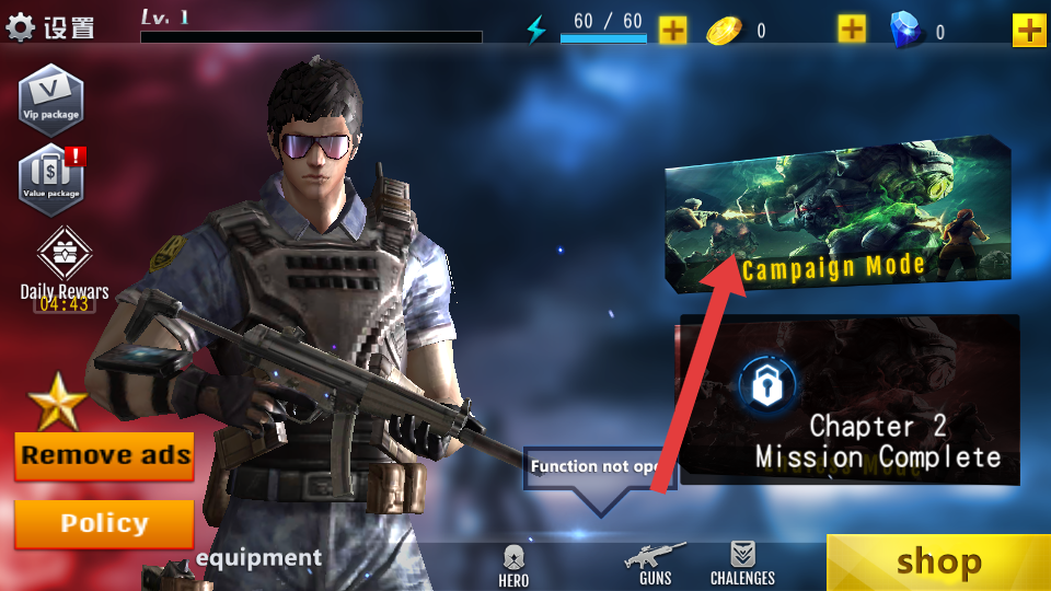 3、通关获金币、经验,返回主界面升角色等级,去equipmen装备、GUNS枪械页强化,推进后续章节关卡。