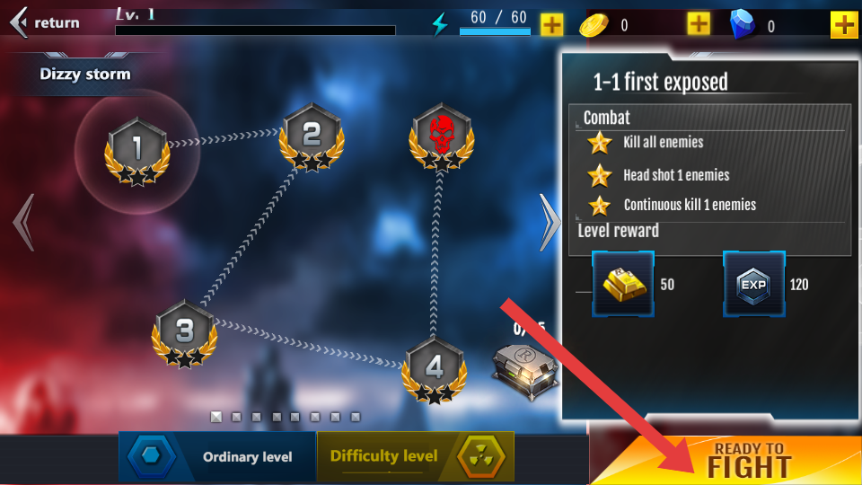 1、进入游戏,主界面点Campaign Mode战役模式,选Dizzy storm章节1-1关卡,查看任务后开始战斗。