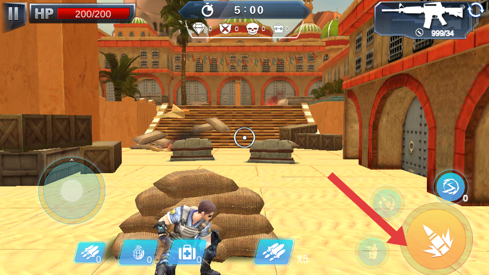 2、战斗场景用左侧摇杆移动,右侧射击、技能按钮攻击,躲在沙袋后卡视野,优先爆头清敌,完成条件。