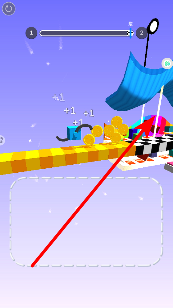 2、方块前行中,沿彩色赛道移动,拾取沿途金币与形状道具,借助绘制形状跨越障碍、保持平衡,朝着终点方向持续推进,适配赛道变化。