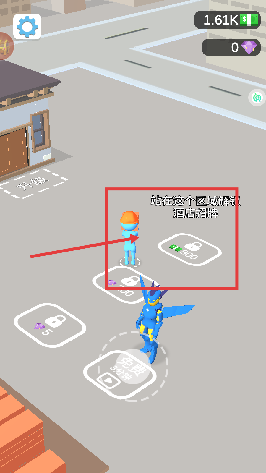 2、让工人站在【解锁酒店招牌-800】区域,消耗金币解锁装饰,提升建筑外观。