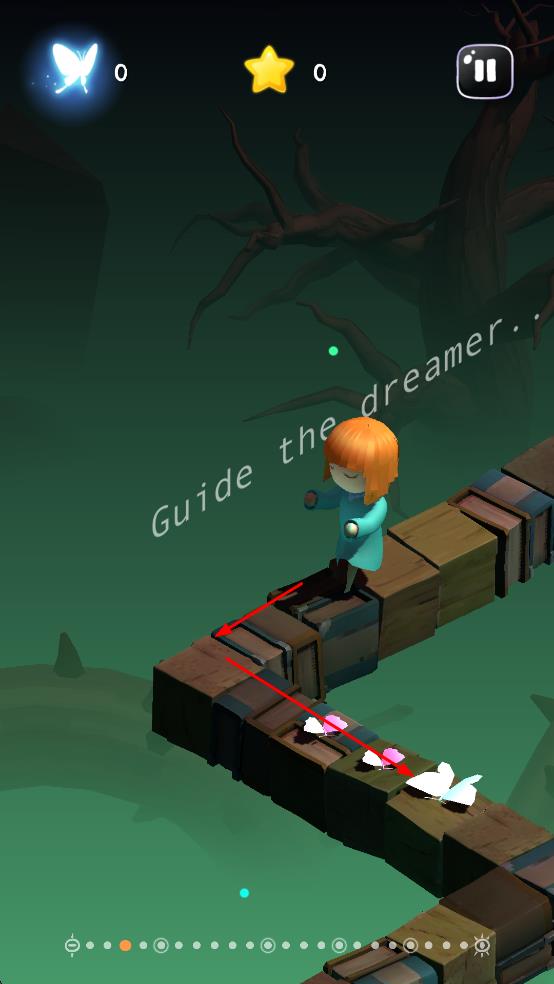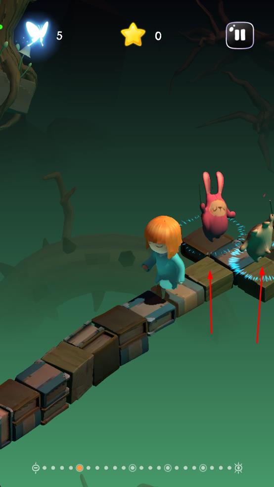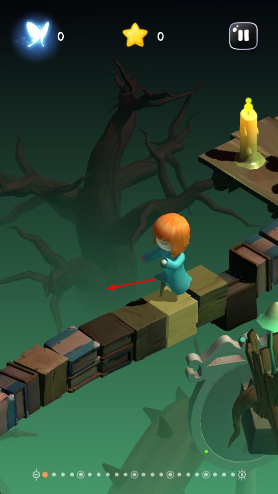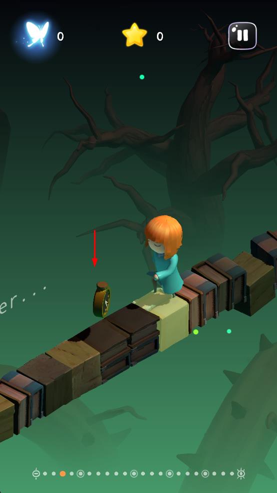 1、操控角色在木栈道移动,收集发光蝴蝶与星星,拾取时钟道具,解锁场景变化。