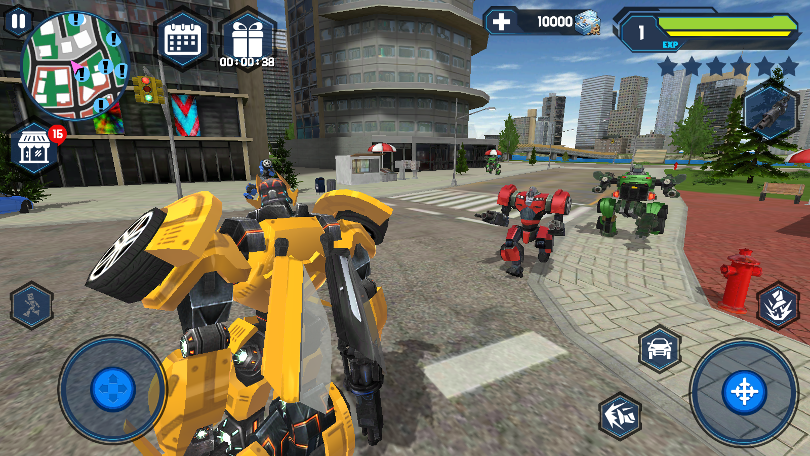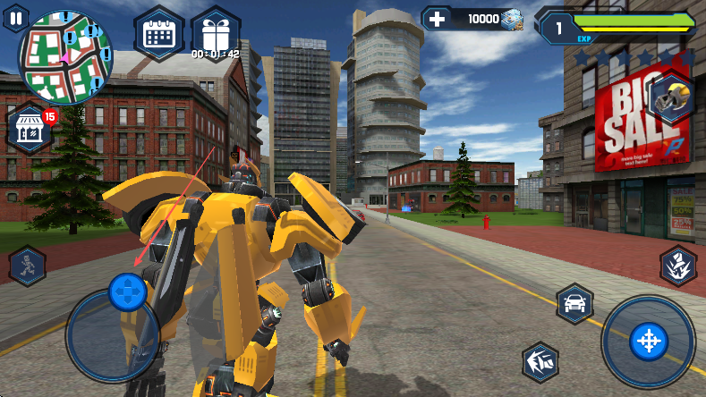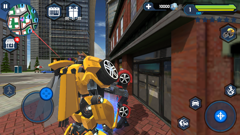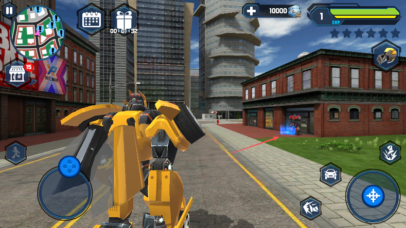 1、进入游戏,操控黄色机器人,利用左下角蓝色虚拟摇杆移动,熟悉城市环境,留意左上角小地图了解位置。