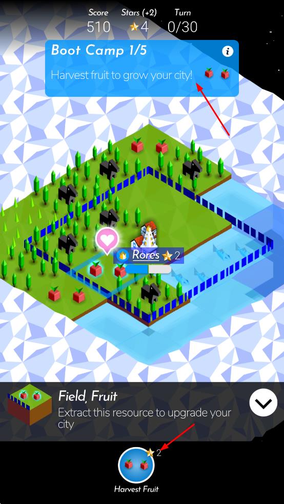 1、Boot Camp阶段,点击Harvest Fruit收集水果,升级城市,提升规模。