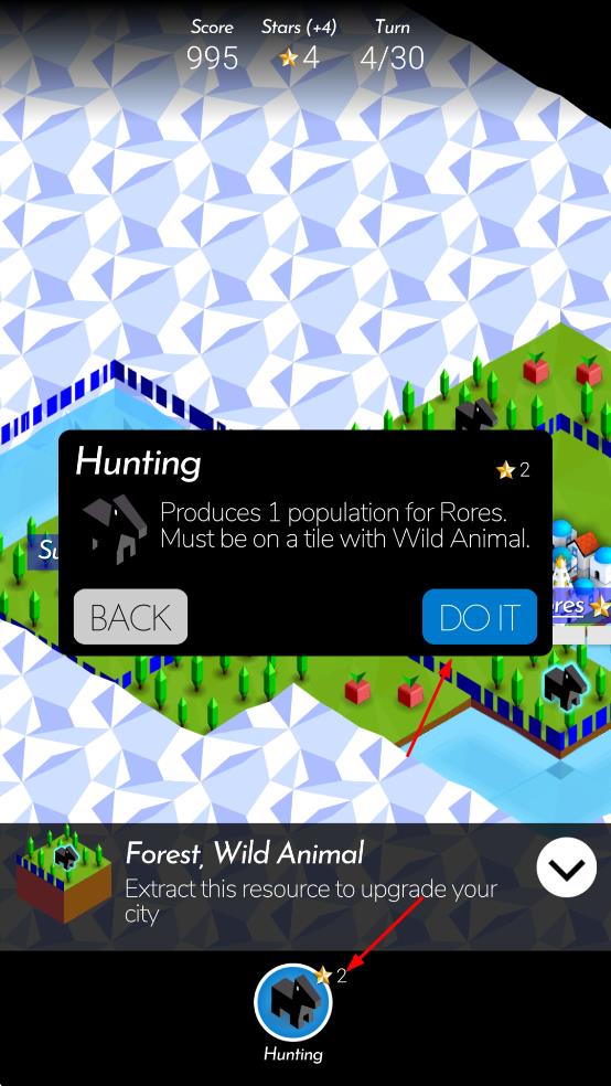 3、移动单位占领村庄,点击Hunting在野生动物地块狩猎,增加城邦人口。