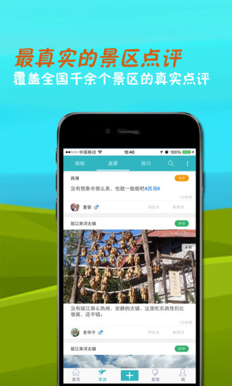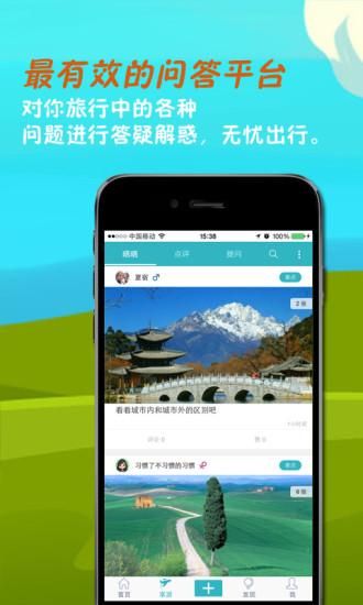享游板块:分为点评,提问,晒晒三部分。点评部分在页面展示已有的旅游信息分享,来自于用户的亲身体验,图文并茂。