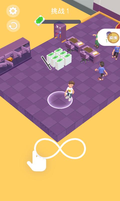 2、潜入过程中,通过滑动屏幕控制角色移动,观察小地图掌握安保位置,待安保转身或人群离开后,快速靠近物资点收集资金。