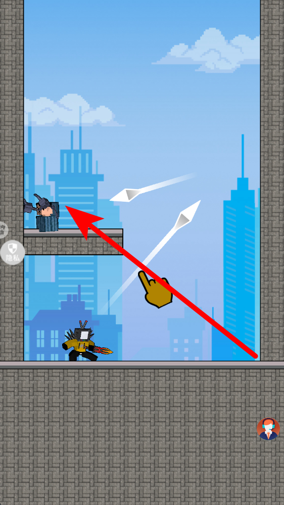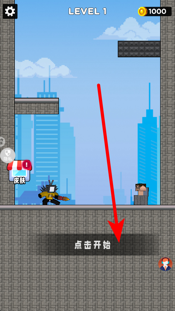 1、进入游戏,在关卡界面点击开始,触发战斗流程,角色身处城市场景,需躲避障碍、应对敌人持武器对手,规划到移动路径。