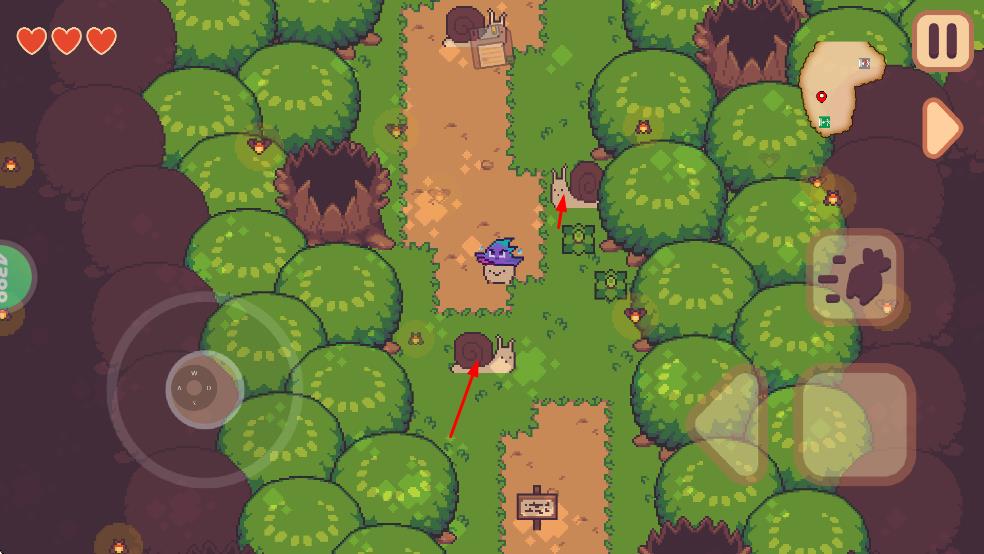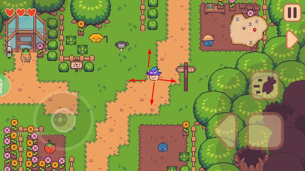 1、通过虚拟按键控制紫色蘑菇造型的角色上下左右移动,在田园与森林结合的场景中探索,开启冒险旅程。
