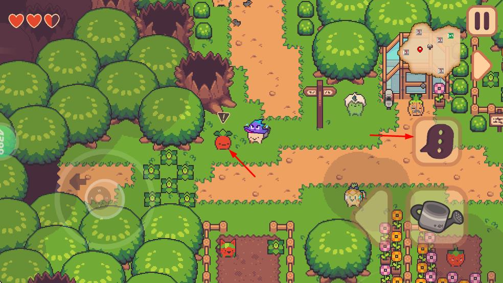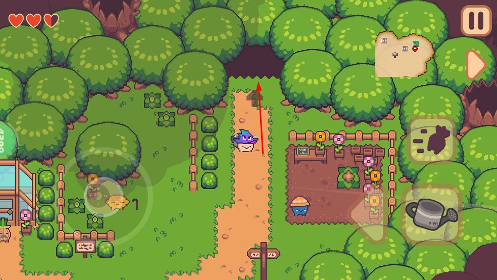 3、探索过程中,点击右侧浇水壶等道具图标,可对农田区域的植物使用道具,同时关注左上角爱心体力值。