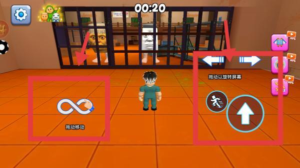1、开局先熟悉操作,通过【拖动移动】控制角色,用【拖动以旋转屏幕】调整视角,注意时间【00:20】内的行动。