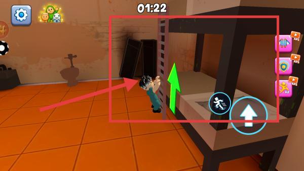 2、遇到梯子时,操控角色靠近并向上攀爬,利用【绿色箭头】指引,抓紧时间【01:22】推进流程。