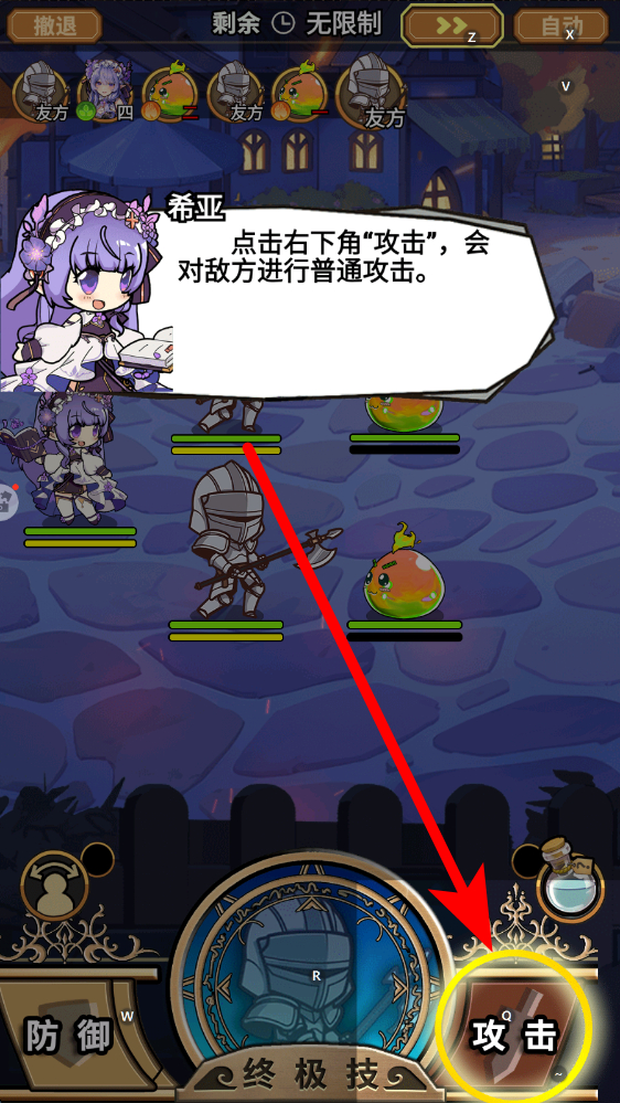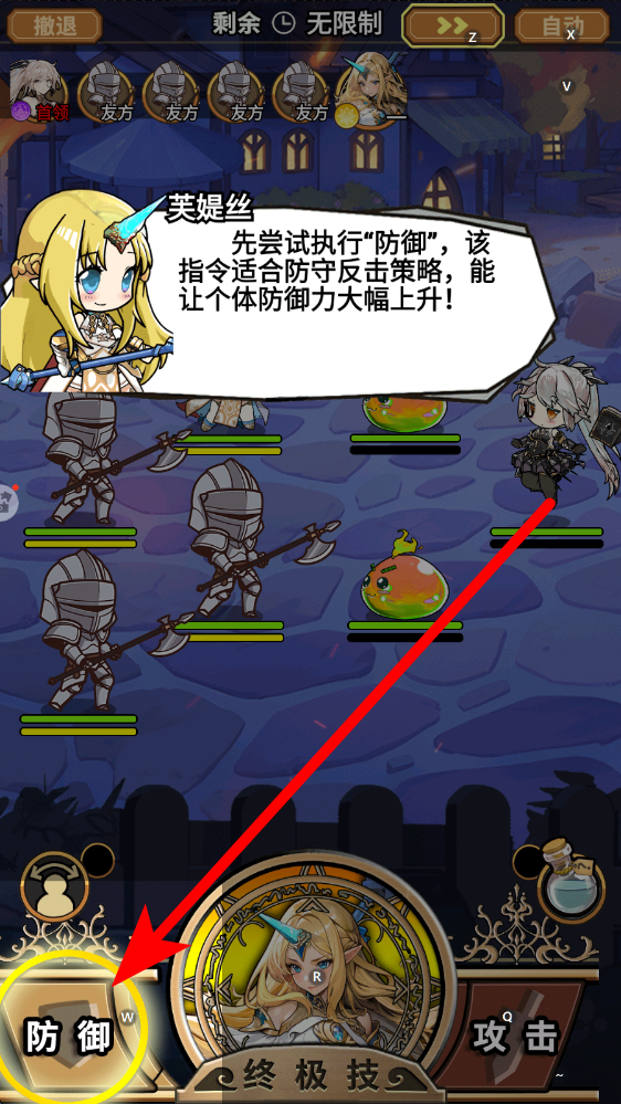 3、当需要防守反击时,点击防御按钮,角色防御力会大幅上升,能有效抵御敌方攻击,或者使用终极技能,为后续反击创造条件。