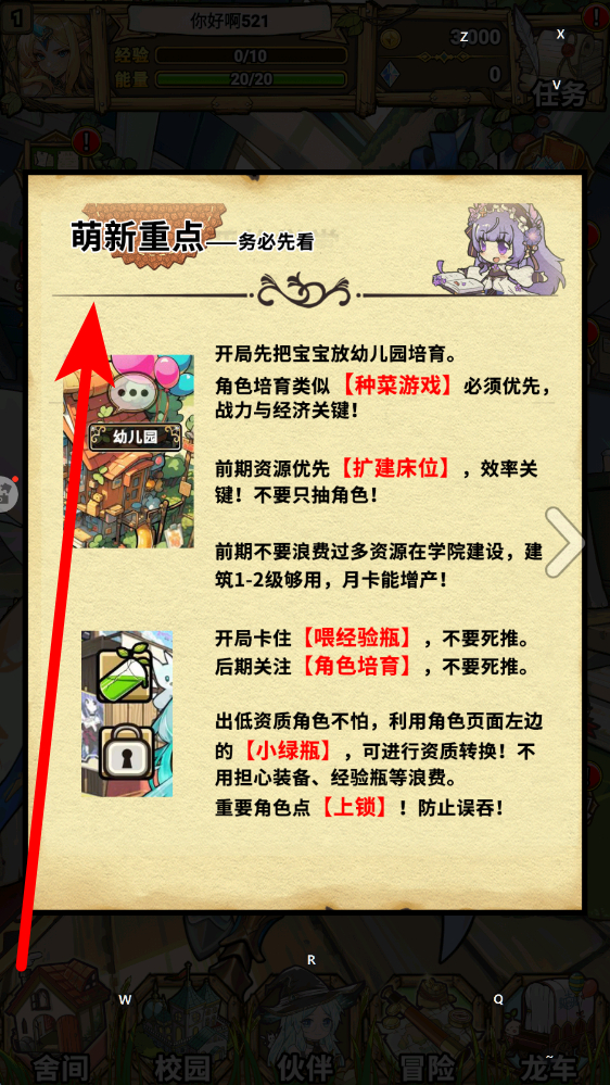 1、开局时,要把宝宝放到幼儿园培育,角色培育类似种菜,需优先进行,这对提升战力和经济状况至关重要,是萌新起步的关键步骤。