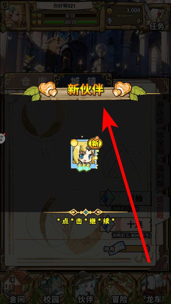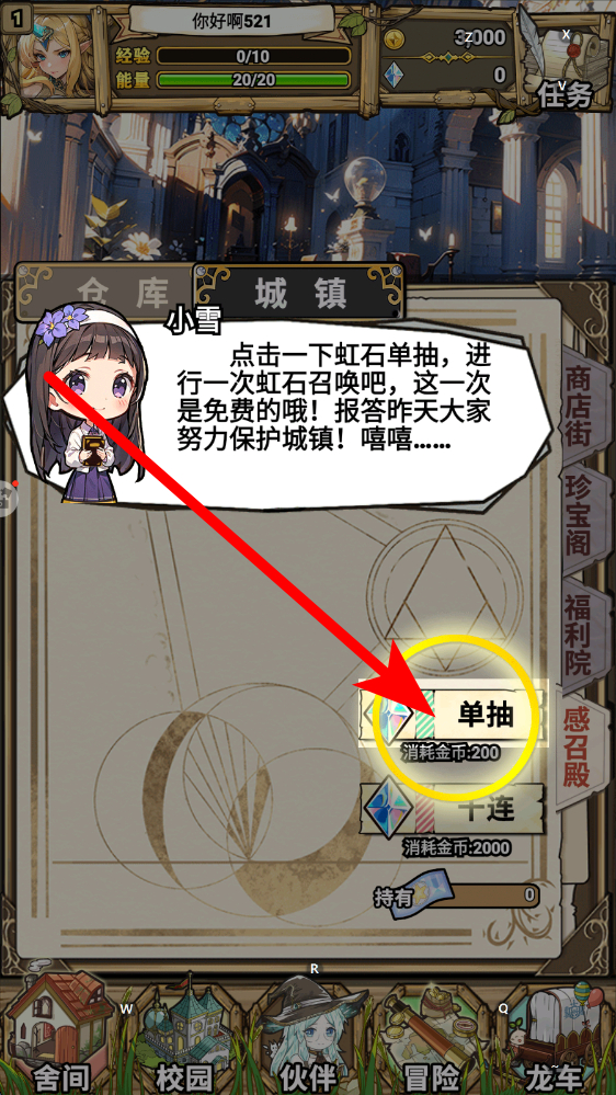 3、开局若卡住,可喂经验瓶,后期要关注角色培育,出低资质角色利用小绿瓶资质转换,重要角色点击上锁,另外虹石单抽召唤,有机会获得新伙伴。