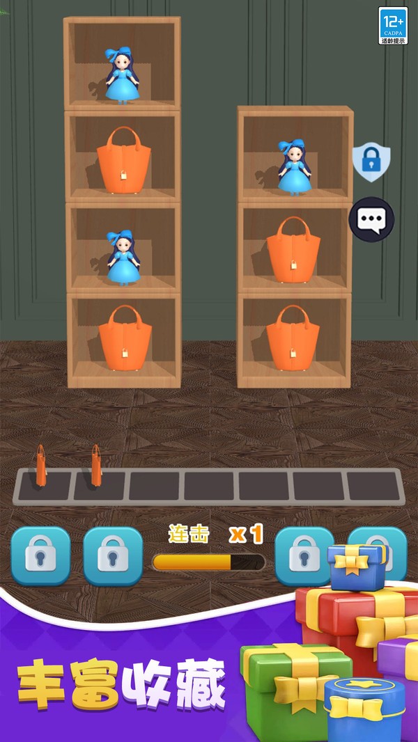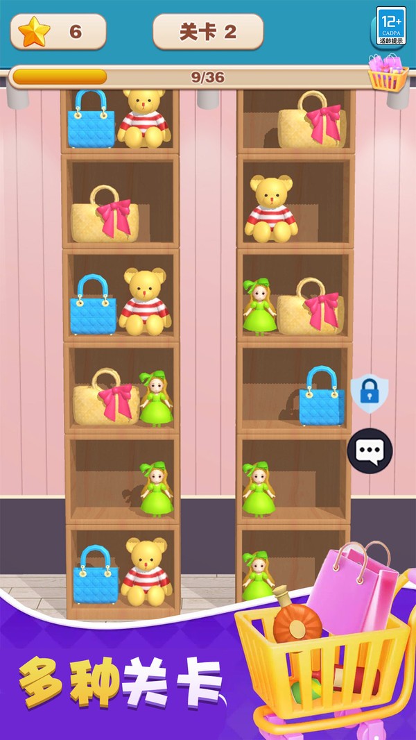 1、关卡1开始,界面显示【0/12】进度,货架上有蓝色娃娃和橙色包包,先从下方橙色包包开始收集。