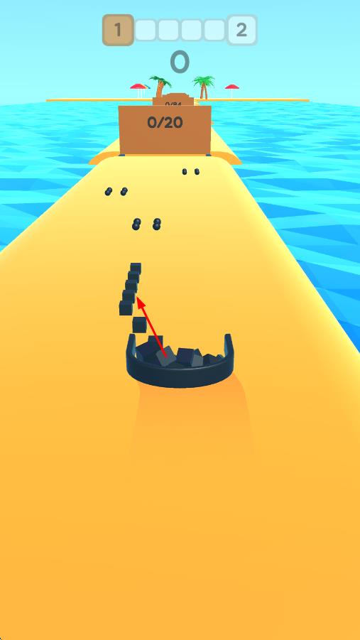 1、控制容器收集黑色方块,朝着【0/20】的目标积累,逐步前进别让方块掉落。