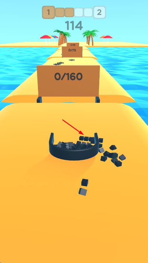 3、面对新的【0/160】目标,继续操控容器收集黑色方块,注意保持方块在容器内,高效积累数量。