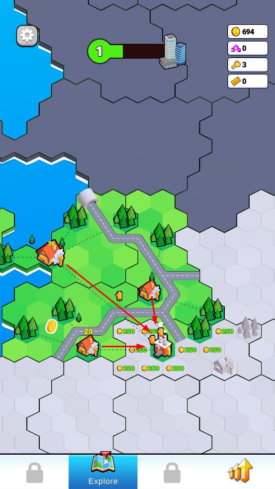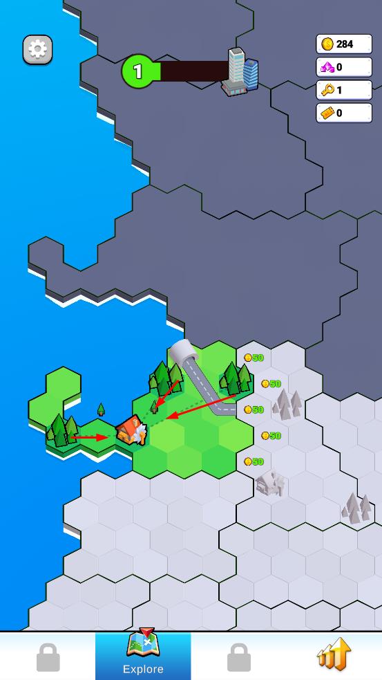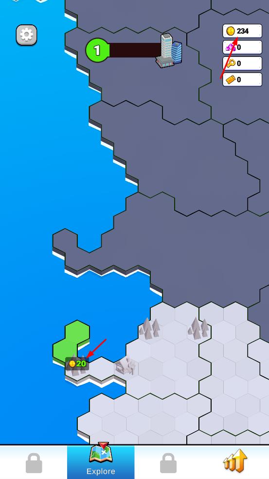 1、在六边形地图中探索,点击标有金币的地块如+20金币地块,获取初始资源,为后续建设积累资金。