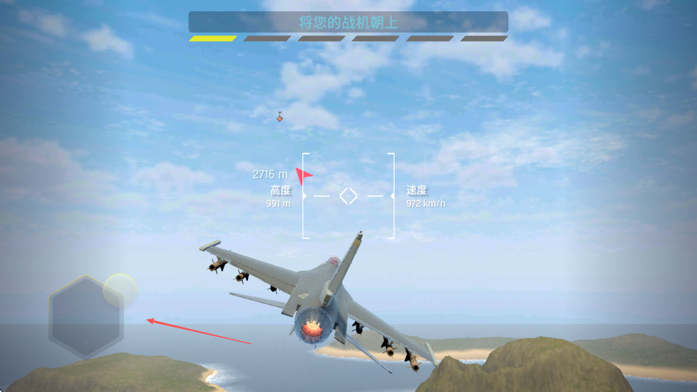 1、进入游戏按将您的战机朝上提示、用左下角虚拟摇杆调战机飞行方向、留意高度991m,速度972km/h、掌握战机实时状态即可。