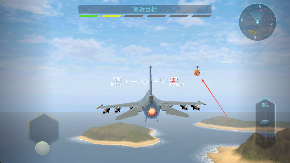 2、按靠近目标指令、借右侧罗盘确定目标方位、用虚拟摇杆控战机移动、调整飞行路线、持续关注与目标相对位置直至靠近。