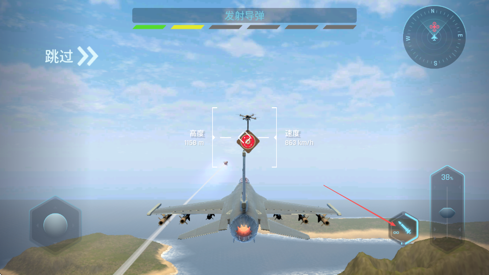 3、接近目标后见发射导弹提示、点击屏幕右侧导弹发射按钮、向目标发射导弹攻击、后续战斗灵活用此操作打击敌方目标。