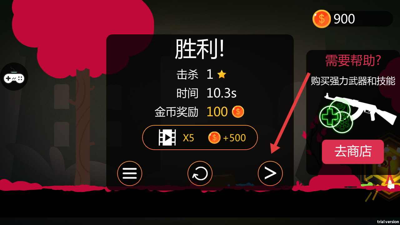 3、成功击败敌人后,会显示胜利界面,可查看击杀数、用时和金币奖励,点击右侧箭头按钮可进入下一关,也可去商店购买强力武器和技能。