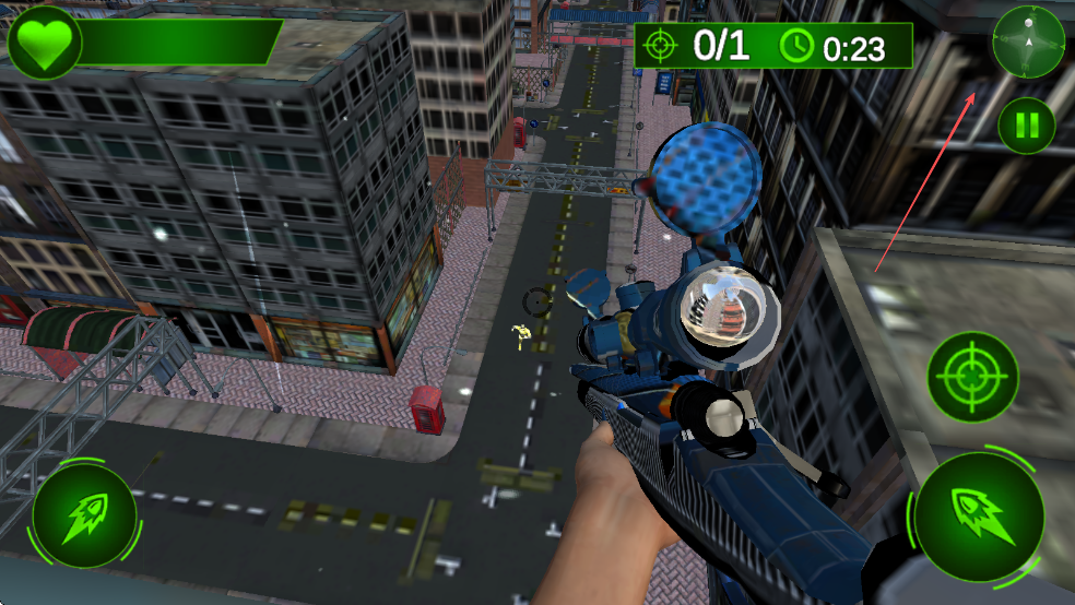 3、点击右侧瞄准按钮,进入狙击镜视角,将准星对准目标,把握时机射击,完成击杀目标的任务。