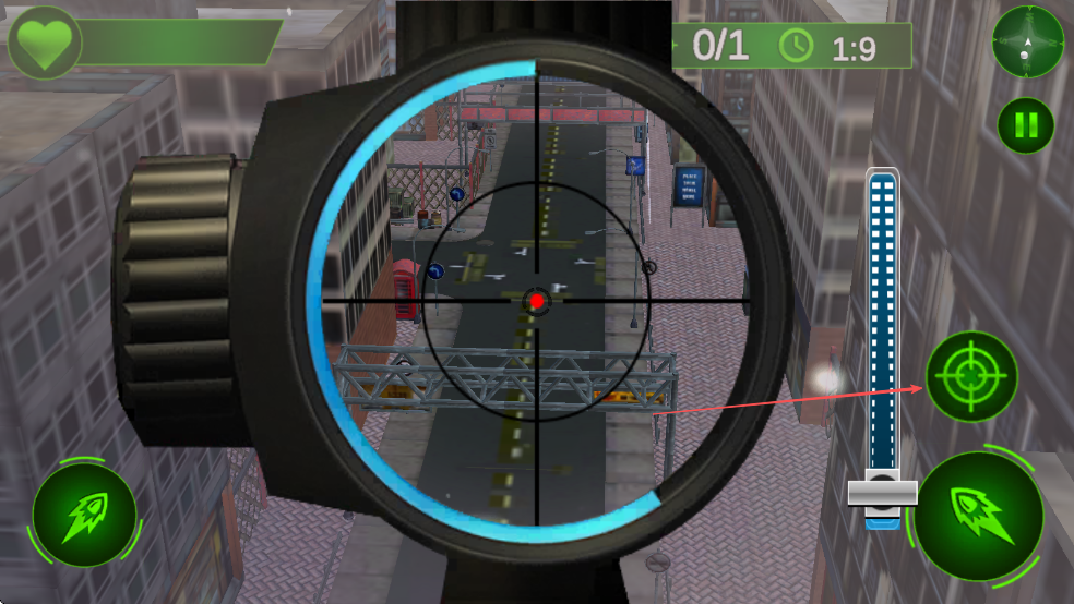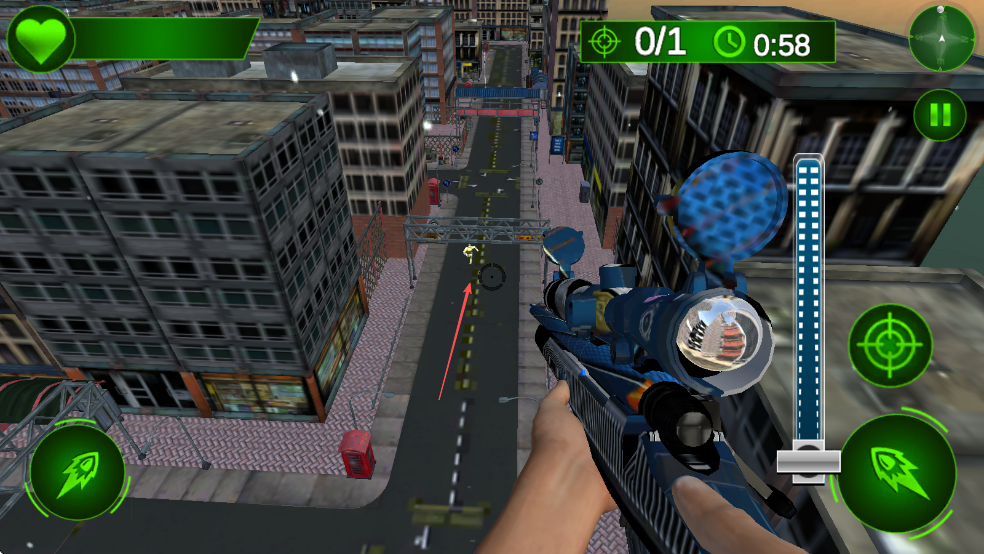 2、狙击操作与目标击杀:进入3D城市战场后,移动到指定狙击点,打开瞄准镜寻找匪徒,观察界面中的风速与距离数据,拖动瞄准镜微调角度,避开平民与障碍物。