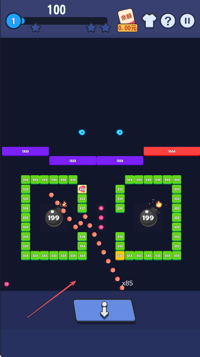 3、持续发射弹球,观察弹球轨迹,调整发射角度,尽量撞击更多方块,提升关卡分数,获取更高星级评价。