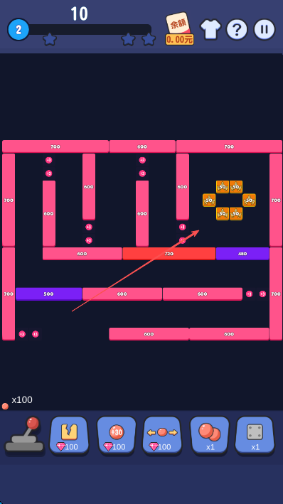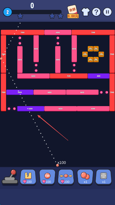 2、来到关卡2,利用屏幕下方的道具按钮,如花费100钻石使用道具,增强弹球效果,攻击更多方块。