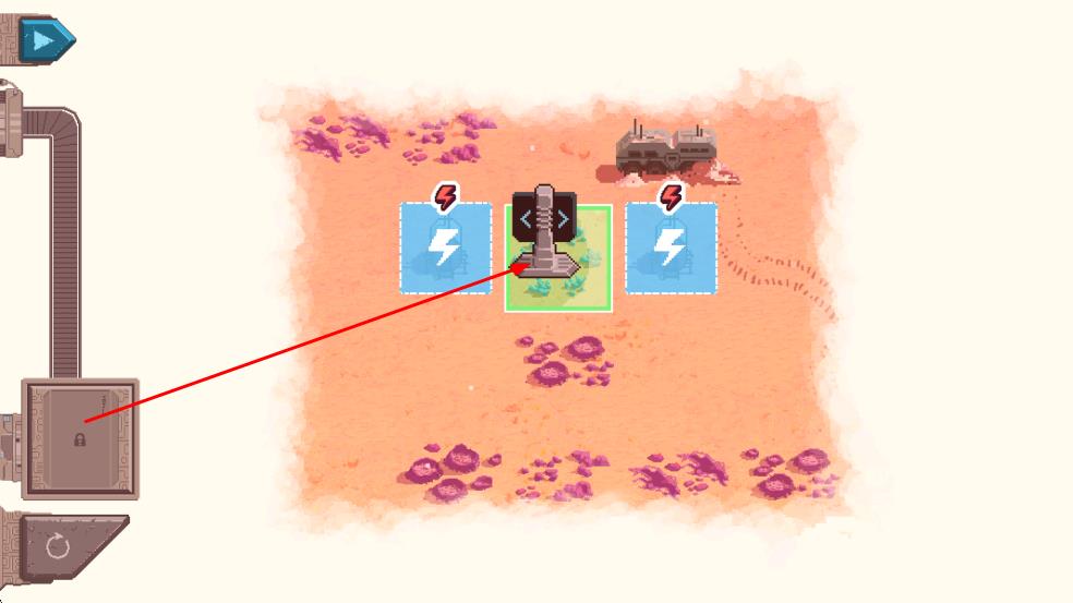 1、在沙漠风格场景中,先在带有闪电标识的蓝色区块放置核心装置,为后续建筑搭建能源基础。