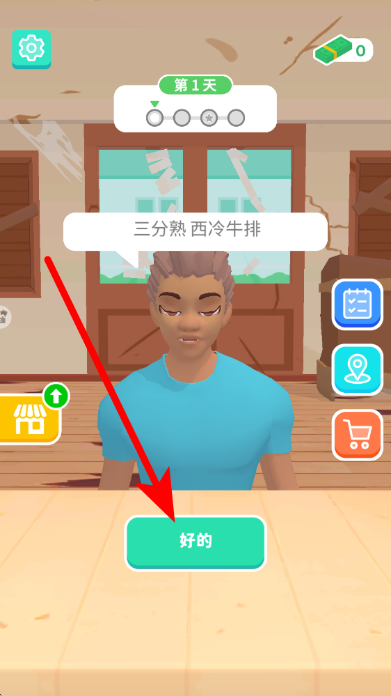1、开始游戏时,当顾客提出菜品需求三分熟西冷牛排时,点击好的,接受订单,开启菜品制作流程,为后续烹饪做好准备。