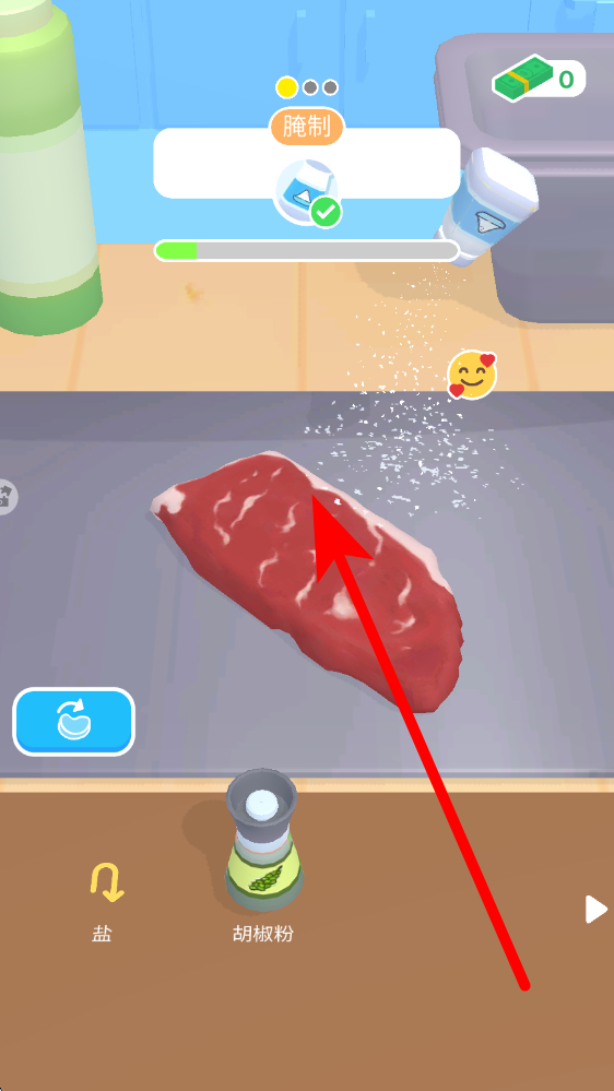 2、进入食材处理的环节,可以对食材牛排进行腌制,根据提示添加调料盐、胡椒粉等,让食材更加具风味,为烹饪打下基础。