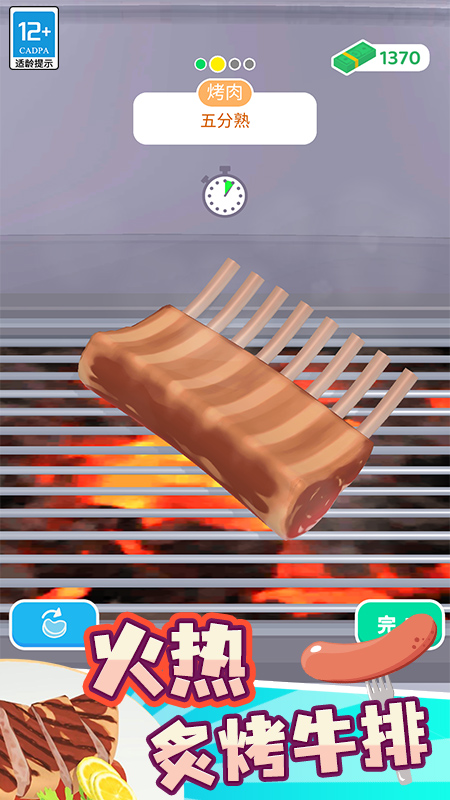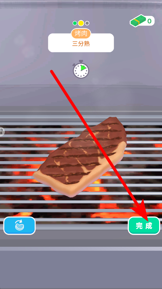 3、腌制完成后,将食材进行烤制,按照要求把控烤制程度三分熟,烤制完成后点击完成,将制作好的菜品提供给顾客完成订单。