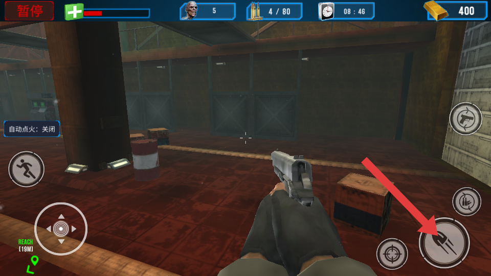 1、在工厂场景中,通过左侧摇杆控制移动,手持枪械探索时留意木箱、油桶等场景元素,关注生命值与任务进度,为行动做准备。