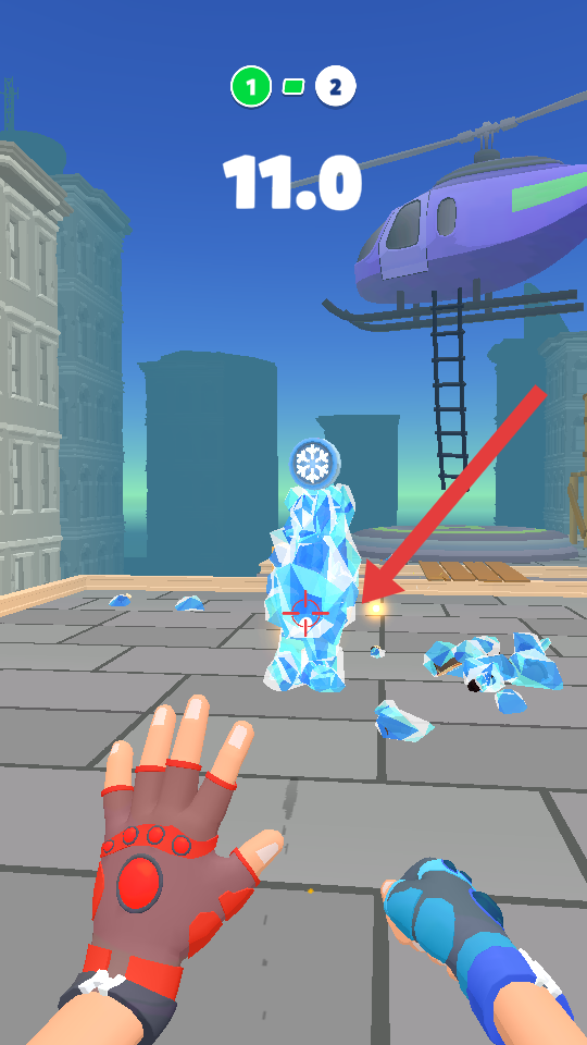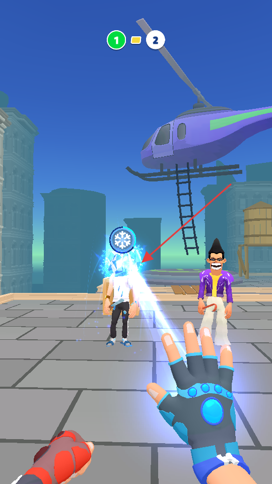 1、瞄准敌人释放手套的冰冻技能,利用带雪花标识的技能效果限制敌人行动,留意紫色直升机区域的后续互动可能。