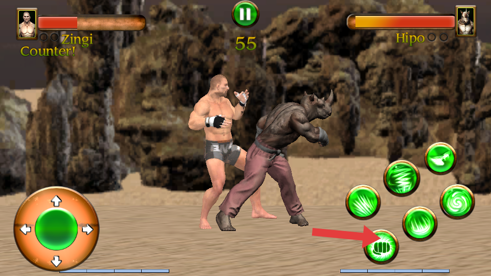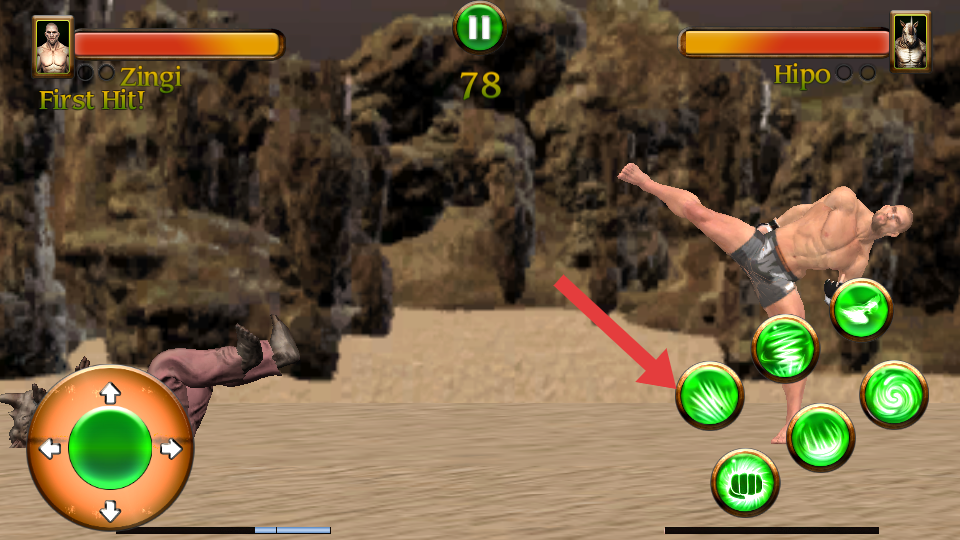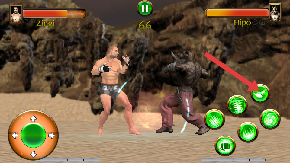 1、用左侧虚拟摇杆控制角色移动,右侧绿色技能按钮可释放踢击、拳击等招式,灵活切换招式应对敌人的攻击动作。