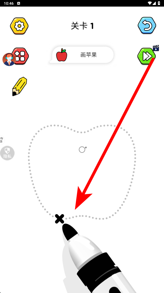 1、打开游戏后,在关卡中会看到绘画提示画苹果,根据虚线轮廓,用画笔工具沿着轮廓进行绘制,勾勒出物体的外形,开启绘画创作。