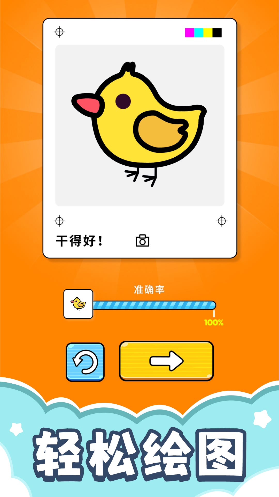 3、当绘画与填色都完成后,若符合要求,会显示已完成,此时可点击箭头按钮,推进到下一个关卡,继续进行新的绘画创作,更多绘画乐趣。