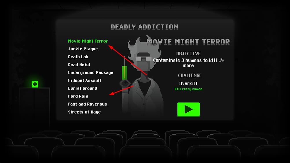 1、在游戏初始界面,可选择不同角色或主题对应的关卡,进入Deadly Addiction等章节。