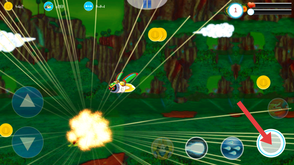 3、通过右侧技能按键发射光束、触发爆炸等特效,击败飞行的敌人带翅膀的敌人单位,持续战斗推进关卡。