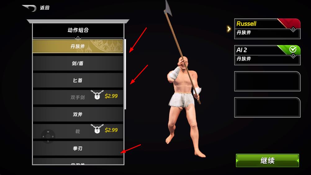 2、在武器选择界面,挑选丹族斧、剑/盾等动作组合武器,选定后点击继续,进入格斗场景。