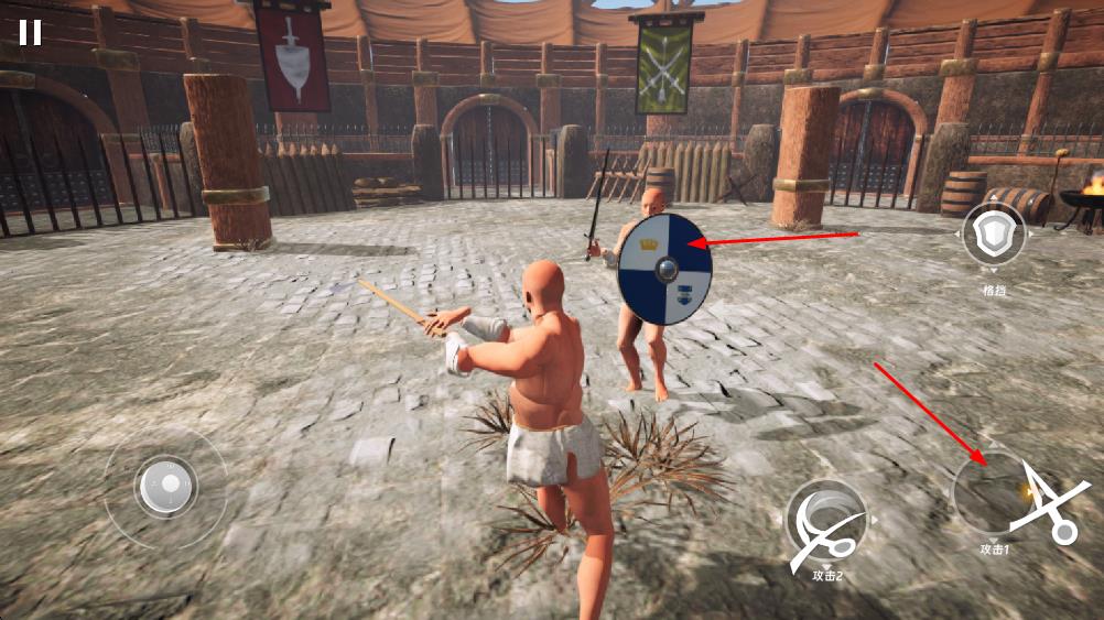 3、在格斗场景中,利用攻击1攻击2按钮发起进攻,同时点击格挡按钮防御敌人攻击,灵活操作击败对手。