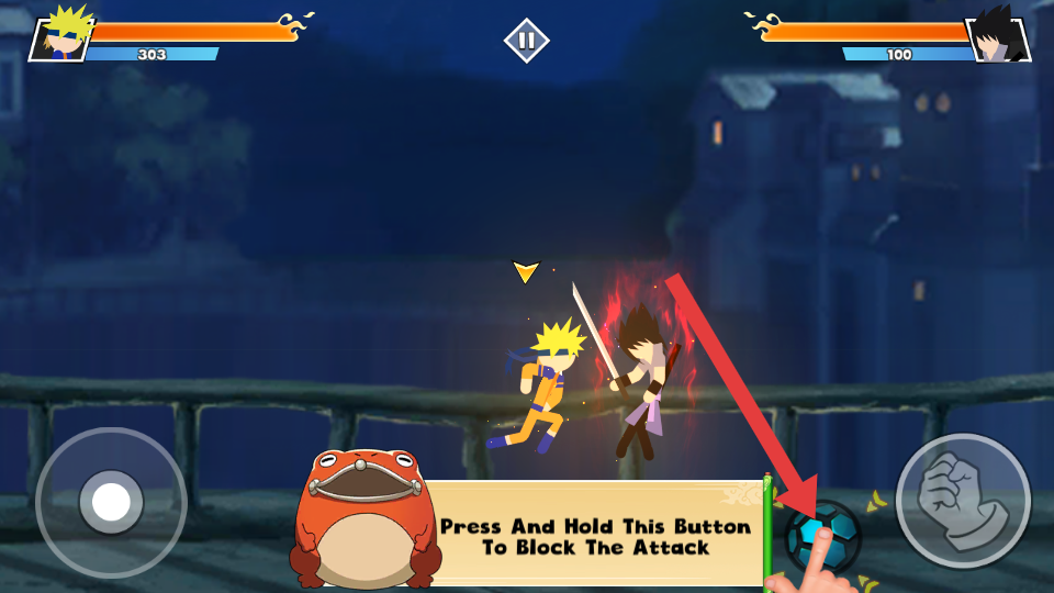 3、场景与提示下,背景为夜晚的城镇的场景包含房屋、水域等元素,游玩内有提示框,如青蛙的造型旁的按键。